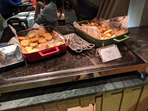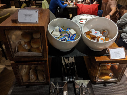 Then I went to the normal buffet / self serving area to see what are the offerings. The bread section is not huge, there are cranberry bread and croissant. I got a cranberry bread but it seems to be more like raisins bread. I also tried out their salad bar, hot soup (Bak Kut Tea; a herbal Chinese soup), unfortunately I was late to the chicken nugget as they were all taken and got replaced by some sort of chips (wedges is also available next to it).