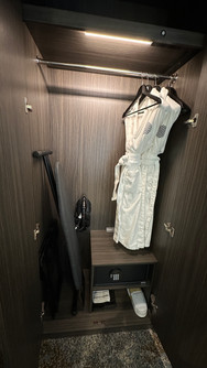 Across the bathroom area is the large wardrobe and bar area, 2 robes and slippers are provided, and some other amenities such as an iron and luggage rack. Across the bar is a lazy lounge couch however the empty space in the center was so vast that it could be a room in itself, the lack of furnishing made it a very weird open space.